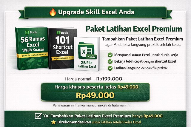 Kelas ini kami desain untuk pemula ( baru belajar excel ) dan orang-orang yang udah tau beberapa rumus excel tapi ingin mengupgrade lagi ilmunya yang masih sedikit ke level advance